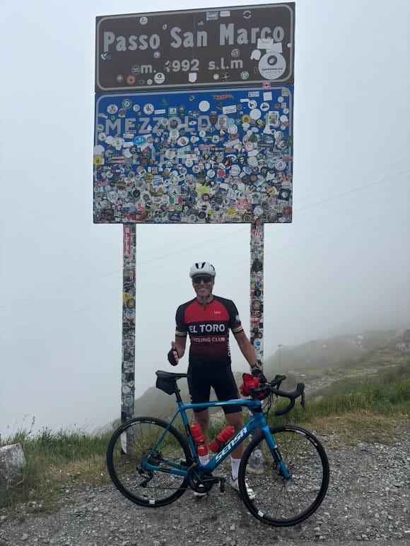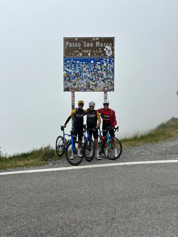 Bou doemde op in de mistwolken van de San Marco en zo was de blauwe fietsenbrigade compleet. Even wachten op Sebas en dan een plan van aanpak maken…want het weer boven op de top was niet echt lekker. Nadat we een kwartetje waren besloten we terug te dalen naar het eerstvolgende dorp…want het begon inmiddels ook wat te regenen. Dit in combinatie met kou is niet fijn op bijna 2.000 meter hoogte…dus als een rappe Toro de daling inzetten.