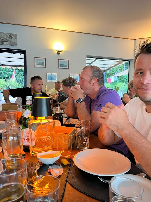We praatten na over de mooie klimmen, waren moe en voldaan en genoten vooral van het feit dat we het allemaal weer goed doorstaan hadden. Ook het vooruitzicht van uiteten gaan was leuk, dus we zaten er lekker in. Voordat we naar het dorpje reden om uit eten te gaan, werden de fietsen alvast ingeladen en werden de meeste koffers al gepakt. Het einde was in zicht, maar eerst nog even met z’n allen genieten van een lekkere maaltijd in een restaurant!
