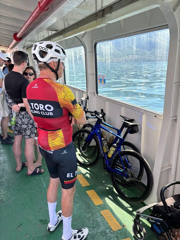 Na een groepsfoto was het tijd om de daling in te zetten naar het vlakke gedeelte. De rit van vandaag was opgesplitst in drie etappes en de eerste etappe was iets meer dan dertig kilometer langs het Comomeer. Prachtig uitzicht en genieten over relatief vlakke wegen. We reden naar Menaggio waar we de veerboot richting Bellagio zouden pakken. Sebas regelde dat de fietsen mee konden en er was even tijd genoeg om mooie foto’s te maken aan het heldere meer!