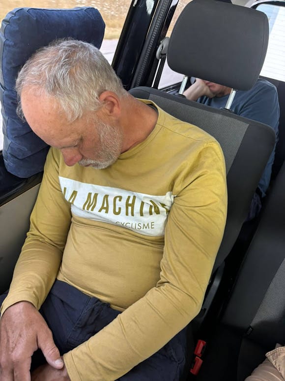 Met Boudewijn achter het stuur en Leo als vertrouwde en betrouwbare bijrijder gingen we voor de eerste shift. Het was vroeg, dus er werd veel geslapen, maar zeker ook gekletst en gegeten. Altijd leuk zo een busritje. Op de achterbank in de bus was het goed toeven…en in dit busje was ook airco op de achterbank dus het was perfect!