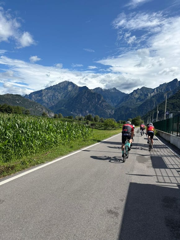 Om 10.00 stonden we klaar voor de groepsfoto. Eerst weer lopend naar beneden en de schoentjes weer achter de poort verstopt. Klaar voor de start, af! Het Zwitserleven langs het water stelde niet teleur. We reden langs prachtige landschappen richting Chiavenna, waar onze klim zou starten. De grootste uitdaging onderweg naar Chiavenna was een afgesloten weg, waardoor we even moesten gravelen…maar daar draaien wij Toro’s onze hand niet voor om.