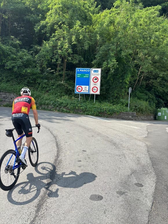 We draaiden de San Marco op en dan is het meteen zoeken naar je eigen tempo. Eigenlijk was het begin redelijk regelmatig, maar halverwege werd het steiler en ging je ook weer even dalen. Al met al gewoon echt een heel pittige klim. Zeker moest je goed in gedachten houden dat de klim 26 kilometer lang was, dus doseren was hier wel op zijn plaats. We gingen in eigen tempo’s omhoog en iedereen beleefde zo zijn eigen strijd met de San Marco!