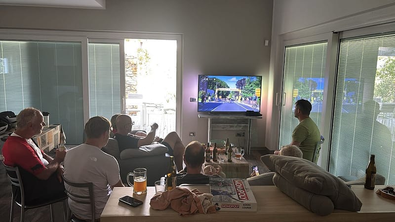 Boudewijn en Maickel gingen nog even de F1 van Silverstone kijken, terwijl de rest aan tafel ging keuvelen en drinken. Het was gezellig maar de vermoeidheid was wel aanwezig bij de meesten. Dag 2 was ook weer pittig, namelijk het hoofddoel: De Ronde van Lombardije! Weer lekker bijtijds onder de wol dus en goed de rust pakken. Ze zeggen namelijk dat je de Tour in bed wint, dus dat zal voor onze fietsvakantie ook wel opgaan. Fietsdag 1 zit erop, slaap lekker en op naar dag 2!