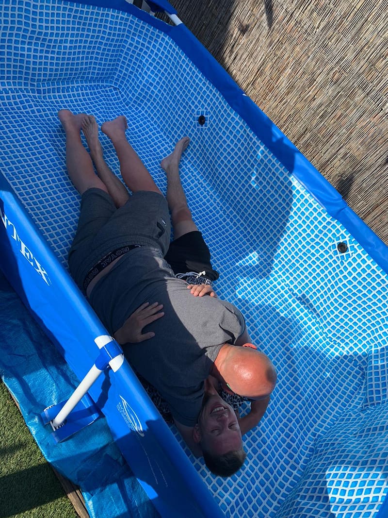 En wat is nou een feest zonder mannenliefde? Precies, geen feest! Zo behulpzaam als de Torro’s zijn, werd nog even een zwembad opgezet in de tuin. Het zwembad werd keurig ingewijd door Joop en Kev. Joop, voor deze keer vergeef ik het je maar je moet weten dat ik jaloers ben aangelegd..