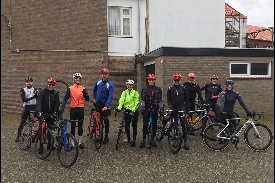 Aan de start stonden de volgende gladiatoren; Leo, Joop, Kevin, Lisette, Bou, Mike, Rob, Sjelleke en onze kleine sprintbom Sebassie. Na een mooie, verregende, groepsfoto sprongen we op onze carbonnen rossen. Klaar voor een dagje regenwater happen.